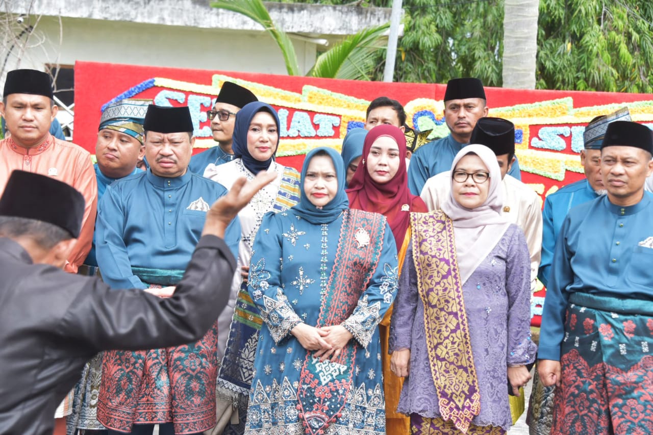 Kedatangan rombongan Bupati Kasmarni disambut dengan tabuhan kompang dan barisan bunga manggar, yang merupakan simbol penyambutan dan kemeriahan dalam budaya Melayu.