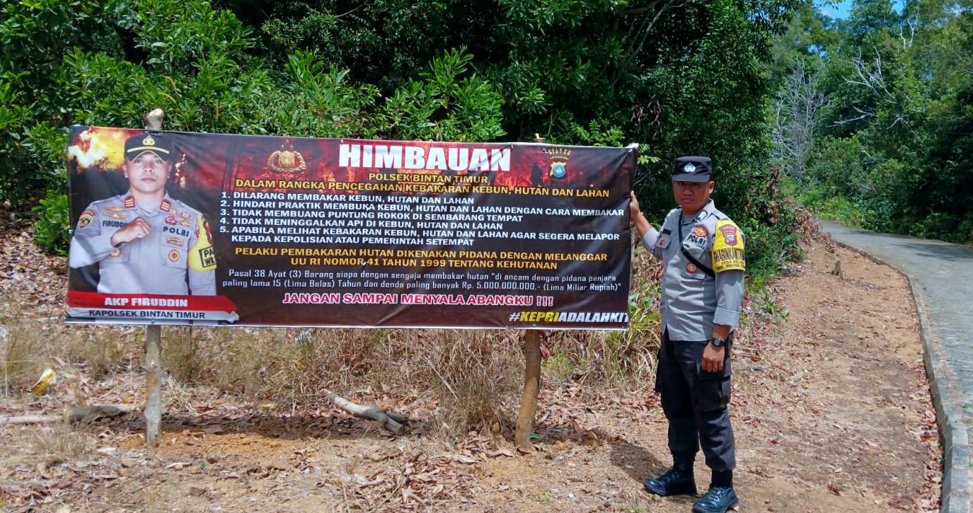 ANAMBASNEWS.COM, Bintan – Dalam upaya mencegah terjadinya kebakaran hutan dan lahan (Karhutla) di wilayah hukum Polres Bintan, Polsek Bintan Timur bersama dengan Komandan Kapolsubsektor Bintan Pesisir mengambil langkah preventif dengan memasang spanduk Karhutla di sepanjang hutan dan lahan di Desa Kelong, Kecamatan Bintan Pesisir, Kabupaten Bintan.