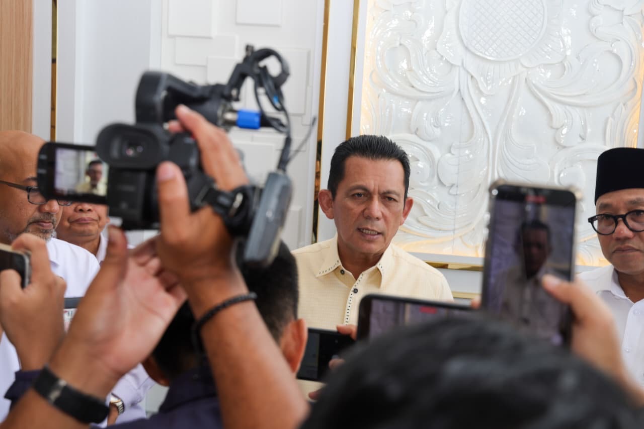 Gubernur Ansar memberikan keterangan pers. Menurut Gubernur, penyerahan aset ini merupakan bentuk dukungan Pemerintah Provinsi Kepri kepada Pemerintah Kota Tanjungpinang dalam meningkatkan kualitas layanan kepada masyarakat. (Harun/DISKOMINFO KEPRI)