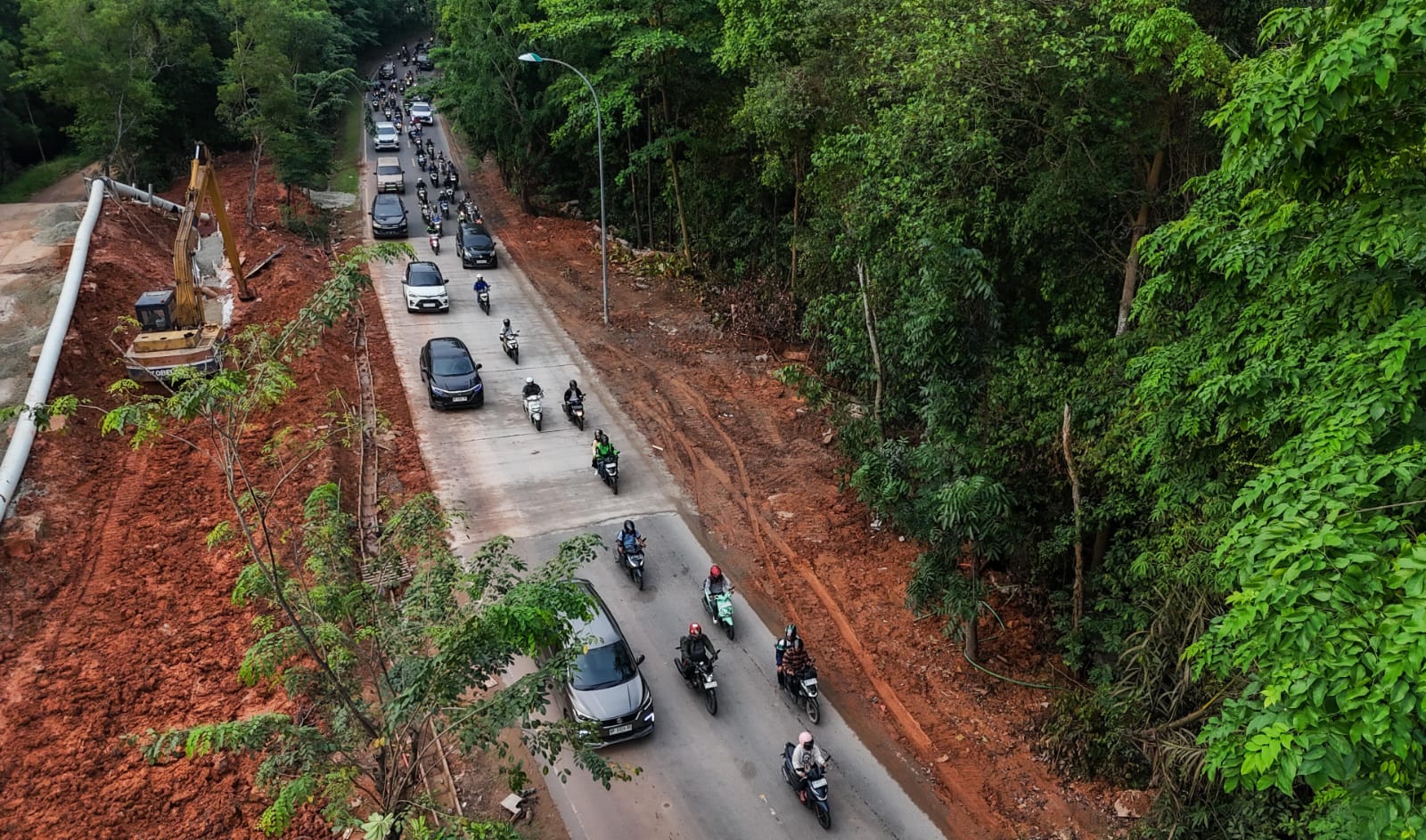 Saat ini, pekerjaan masih berlanjut pada pembangunan saluran drainase di bahu jalan. Setelah tahap ini selesai, akan dilakukan pengaspalan pada permukaan jalan yang telah dibeton tersebut.