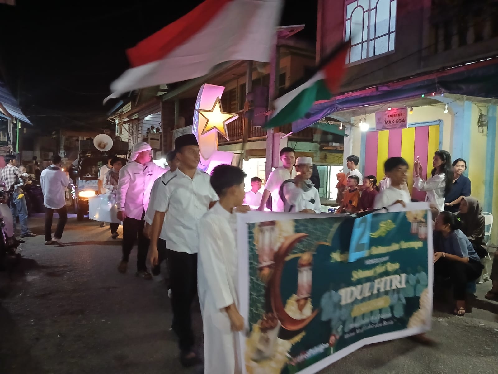 Peserta tampak membawa obor serta miniatur masjid yang dihias dengan lampu warna warni membuat suasana malam takbiran menjadi lebih berwarna.